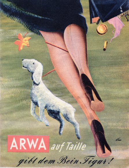 Die Abbildung links zeigt eine Anzeige der Firma ARWA für Perlon-Damenstrümpfe mit Nähten auf der Rückseite von 1951. Diese wurden von Flachstrickmaschinen hergestellt, die Strümpfe in einem zweiten Arbeitsgang dann hinten zusammengenäht. Zur Herstellung von nahtlosen Strümpfen brauchte man völlig andere, nänmlich Rundstrickmaschinen. Diese kamen erst Mitte der fünfziger Jahre auf und führten zum Konkurs etlicher Betriebe, die nicht rechtzeitig in die neue Technologie investiert hatten. Für die Männerwelt waren die Nahtstrümpfe sicherlich reizvoller, für die Frauen hingegen ein Problem, da ständig verrutschende Nähte die Trägerinnen als schlampig erscheinen ließen. Die permanente Kontrolle der Strumpfnähte führte zu Dauer-Stress. Die Frauen empfanden es geradezu als Erlösung, als endlich die nahtlosen, im Volksmund Mannesmann-Röhren genannten, Strümpfe auf den Markt kamen. Innerhalb weniger Monate verdrängten sie die ungeliebten Naht-Strümpfe völlig.