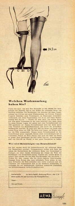 Gonda Sureen, die deutsche Beinkönigin von 1951 (siehe Abbildung rechts), hatte die Durchschnittsmaße der deutschen Frau (Fessel 21,5 cm; Wade 34 cm, Oberschenkel 46 cm), nach der die Firma ARWA fortan der Marktnachfrage entsprechend exakt angepasste Größen herstellen konnte. Das Preisausschreiben mit der Aufforderung, seine Beinmaße anzugeben (siehe Abbildung), war also eine riesige Marktuntersuchung zur Optimierung des Produkts. Im Juni 1951 wurde Gonda Sureen, die als Beruf "Elastik-Akrobatin" angegeben hatte, im Münchner Regina-Hotel zur deutschen Beinkönigin gewählt und durfte sich vor 350 geladenen (meist männlichen) Gästen präsentieren. Ob sie wirklich Tantiemen erhalten hat und was aus ihrer Karriere als "Elastik-Akrobatin" wurde, ist nicht überliefert.